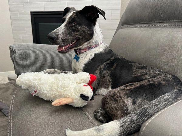 She is such a pretty girl, even more beautiful in person! She is young, probably around a year or likely younger. She is 34 pounds and has such happy, joyful energy! This girl is snuggly, loves attention and being right by her person. Very curious and likes to be a part of whatever you are doing. She is very playful, but not possessive of her toys. She loves to play tug-of-war with other dogs and games of chase are her fav. She has a very relaxed, chill side to her as well and sweet, sweet!
