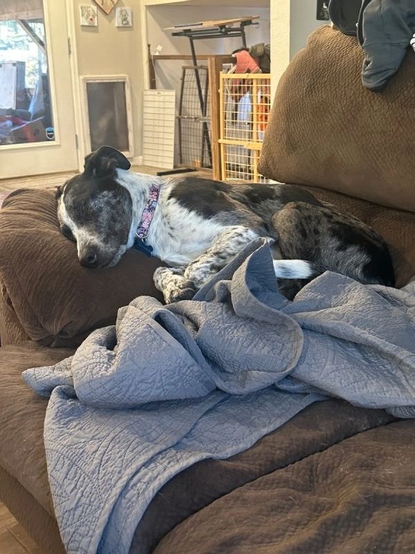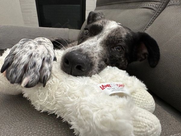 Kora is about a year old, around 35 lbs, and a Catahoula (possibly mix) with big paws—which means she’s likely not done growing into herself just yet. What she already has fully developed? Her affection. This girl is incredibly sweet, loves her people, and is happiest curled up next to a human for maximum cuddle time. Bedtime? She’s all in. Expect an all-night snuggle buddy.